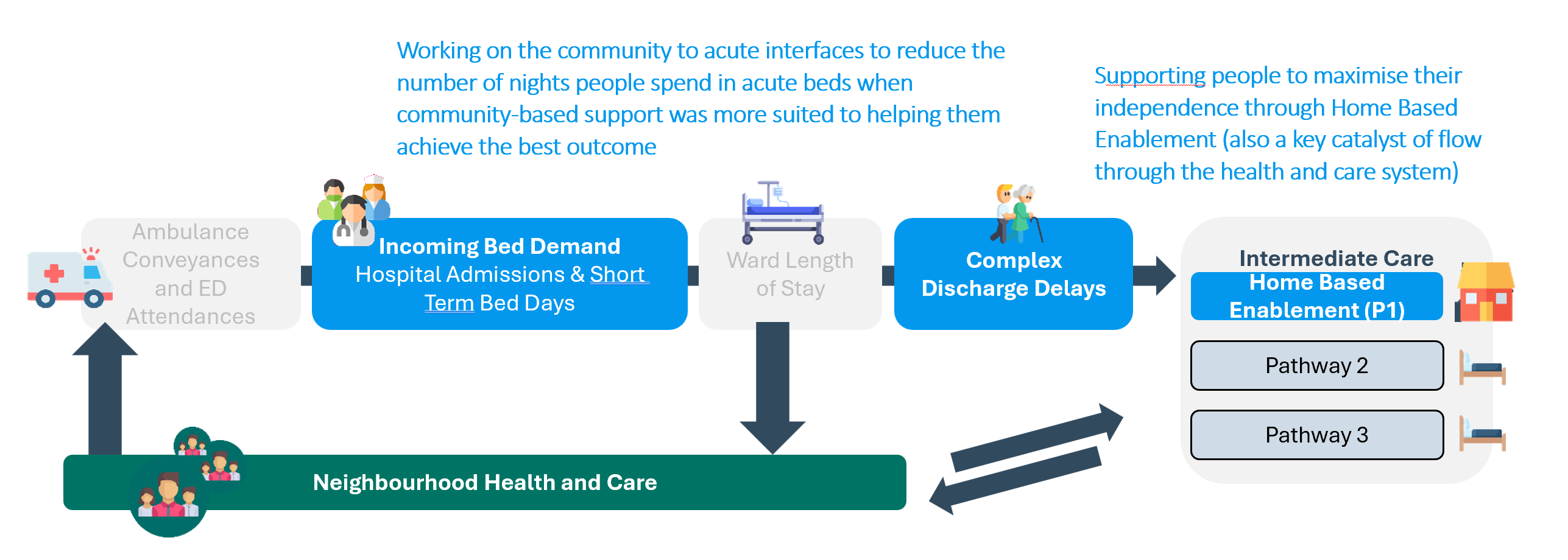 We are focusing on three key workstreams (in blue below), each of which we’ll share more detail on in coming months. All three contribute to the longer term ambition of a greater emphasis on preventative care and the emerging Neighbourhood Health and Care model. |